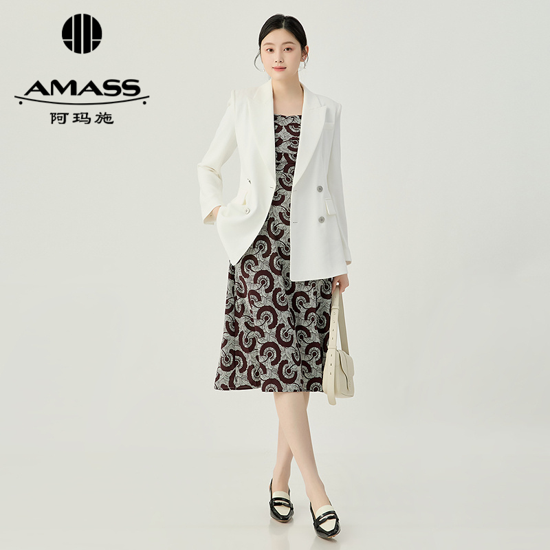 阿玛施AMASS 复古印花方领抓褶设计连衣长裙550046