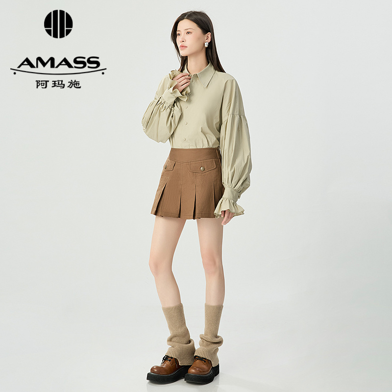 阿玛施AMASS 复古学院风中腰打褶工装风短裙520005