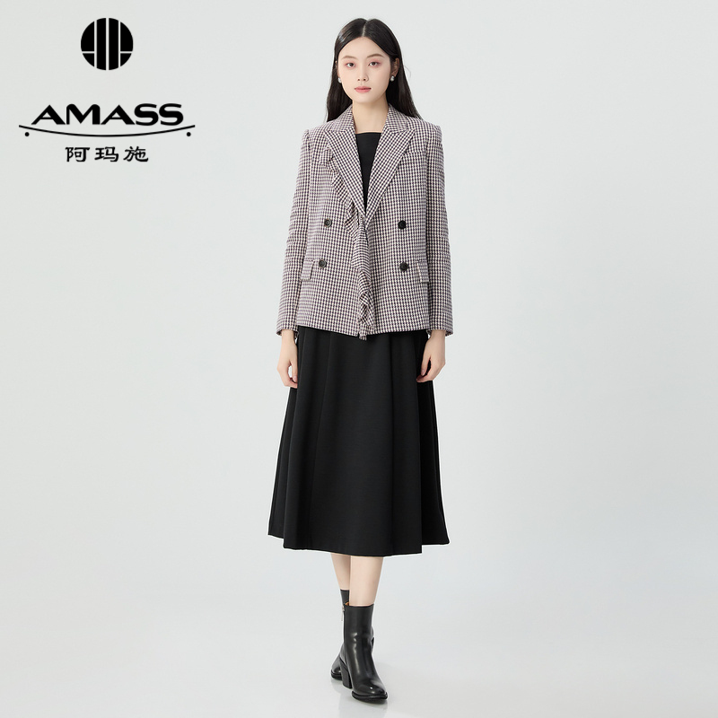 阿玛施AMASS 气质千鸟格纹设计感花边领双排扣西装5400281