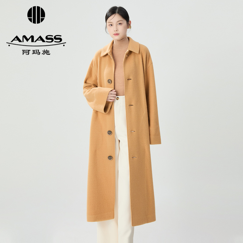 阿玛施AMASS 新款排扣翻领中长款纯色大衣外套5492890