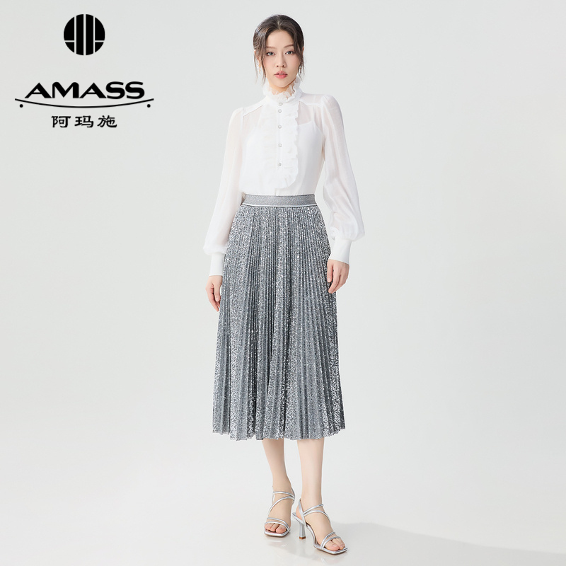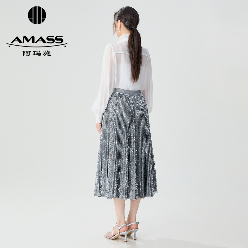 阿玛施AMASS 质感银色亮片百褶长裙5200448