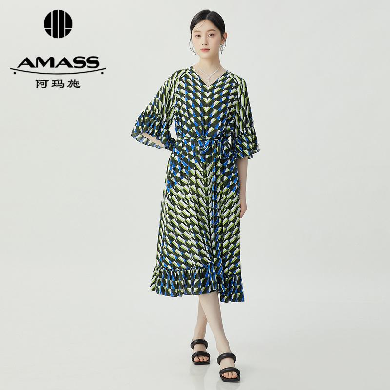 阿玛施AMASS 气质优雅轻盈飘逸V领印花洋装5500538