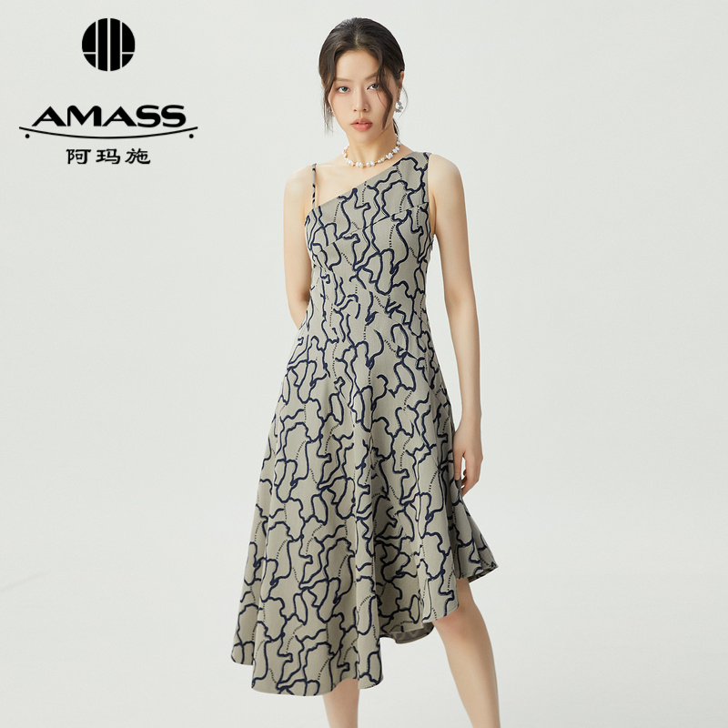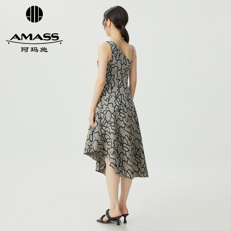 阿玛施AMASS 轻奢款肌理感压花下摆不规则无袖吊带小黑连衣裙5500559