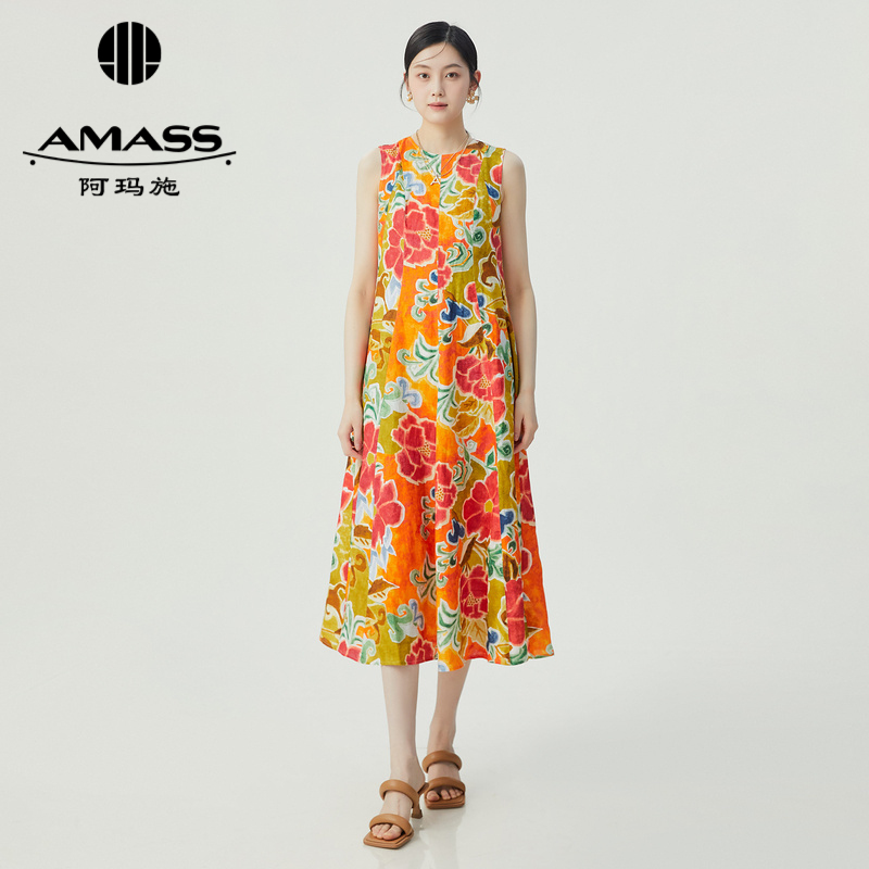 阿玛施AMASS 度假风印花造型感洋装无袖中长连衣裙5500525