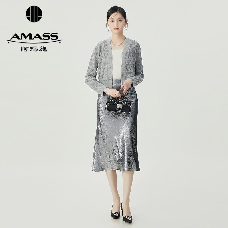 阿玛施AMASS新款桑蚕丝V领麻花排扣开衫5499256