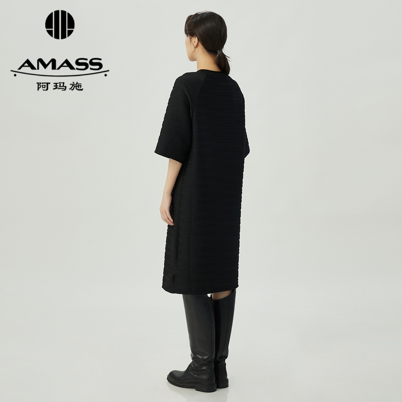 阿玛施AMASS 感圆领宽松短袖纯色连衣中裙5500520