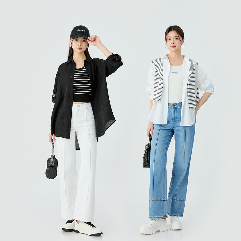 哥弟  高腰裤边剪接设计直筒牛仔裤110001