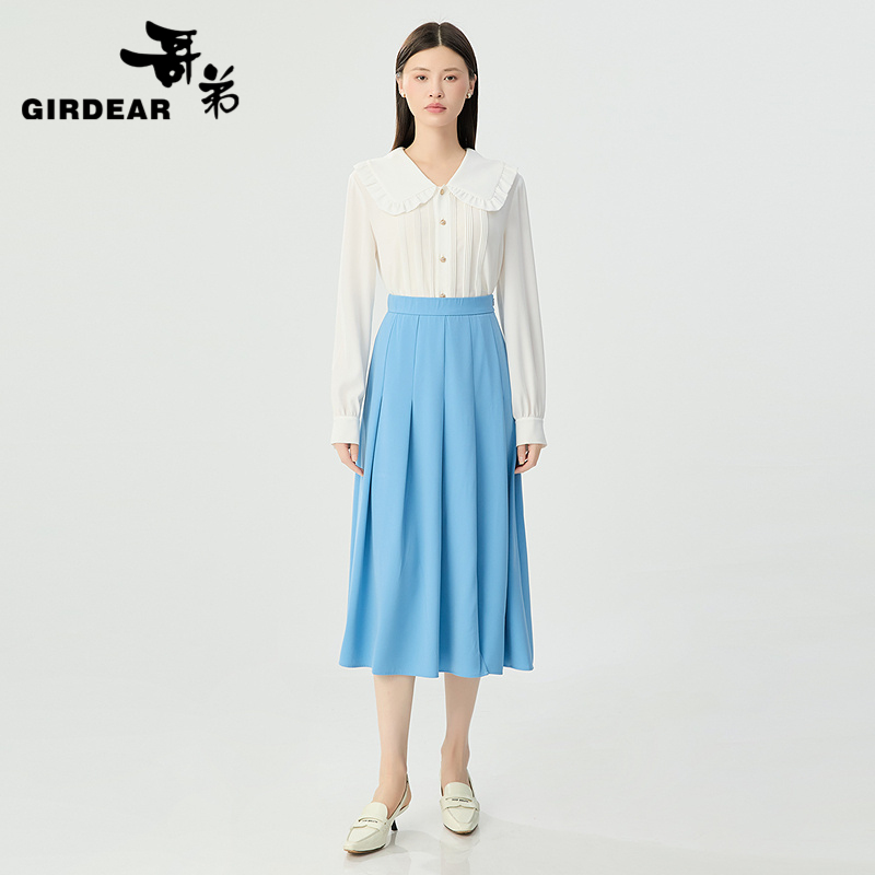哥弟 高腰前片百褶侧开叉半身长裙1200325