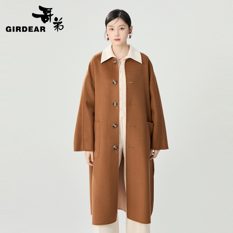 哥弟 圆领双贴袋廓形落肩长款双面呢大衣1400777