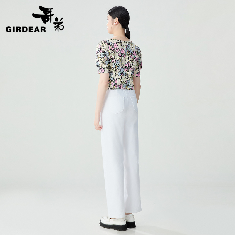 哥弟 法式方领泡泡短袖印花衬衫1300683