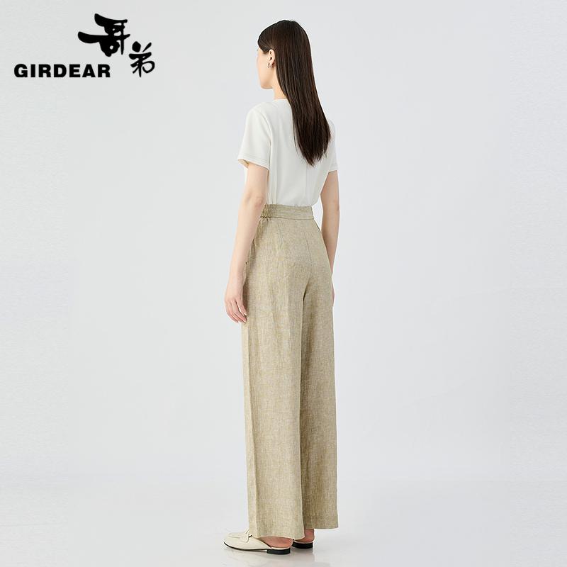 哥弟 高腰松驰感两侧松紧系带亚麻直筒裤110002