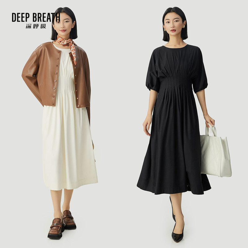 DEEP BREATH深呼吸女装 简约圆领中袖褶皱收腰连衣裙长裙A500313