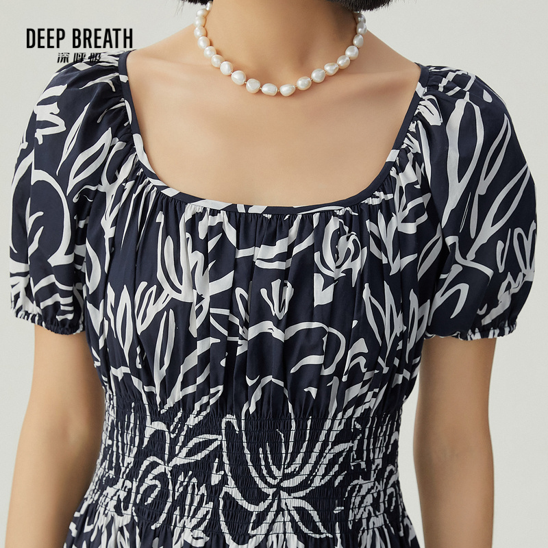 DEEP BREATH深呼吸女装 复古印花方领泡泡袖收腰连衣裙A500249