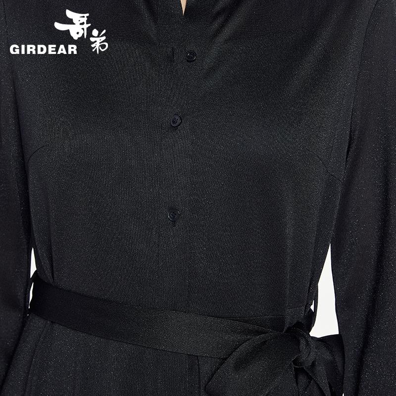 哥弟 翻领长袖自带腰带洋装连衣裙1500290