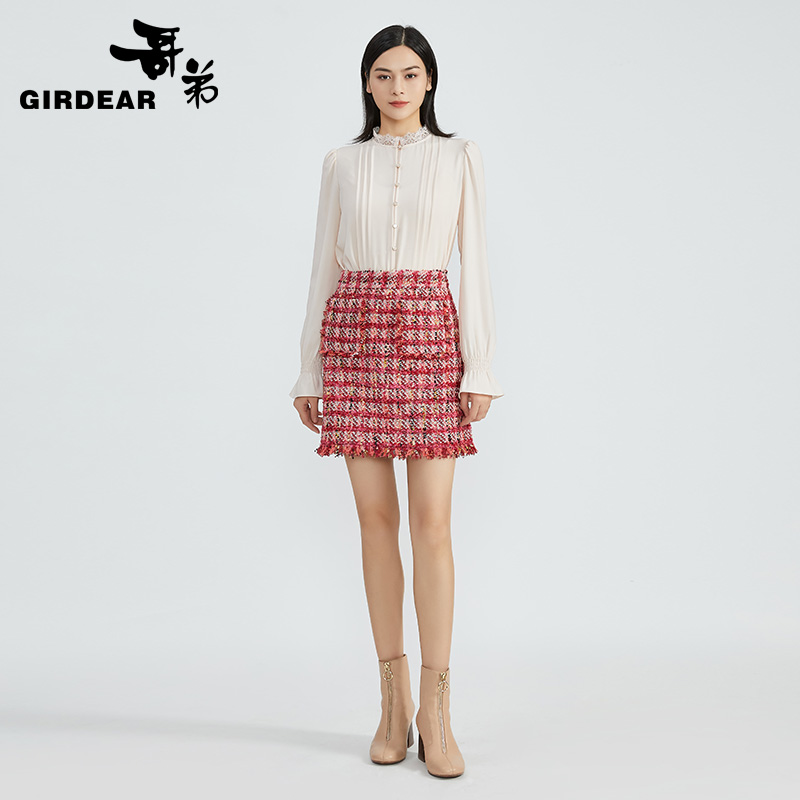 哥弟 气质红格睫毛边小香半裙1200183-7K