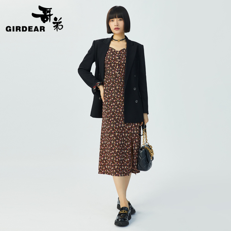 哥弟 复古高级感方领开叉碎花连衣裙1500420