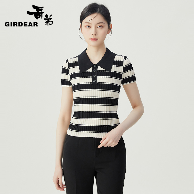 哥弟 坑条经典色拼接Polo领套头短袖针织衫1399614