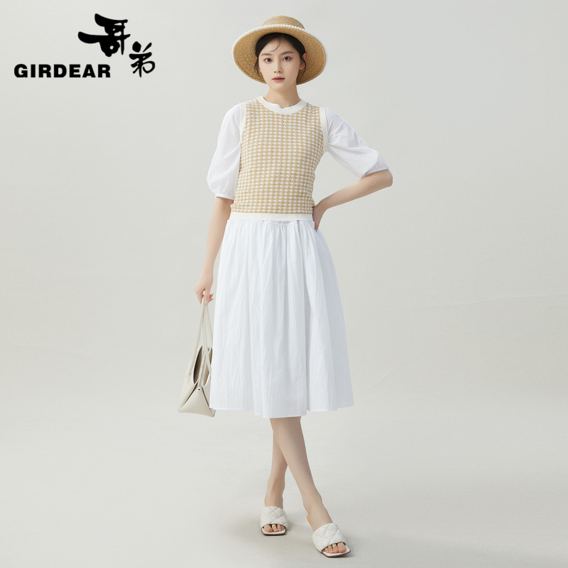 哥弟 圆领纯色拼接设计短袖连衣裙1500457