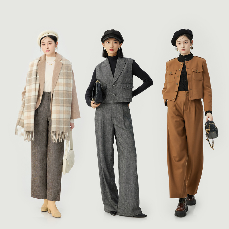 哥弟 高腰两粒扣阔腿羊毛长裤1100468