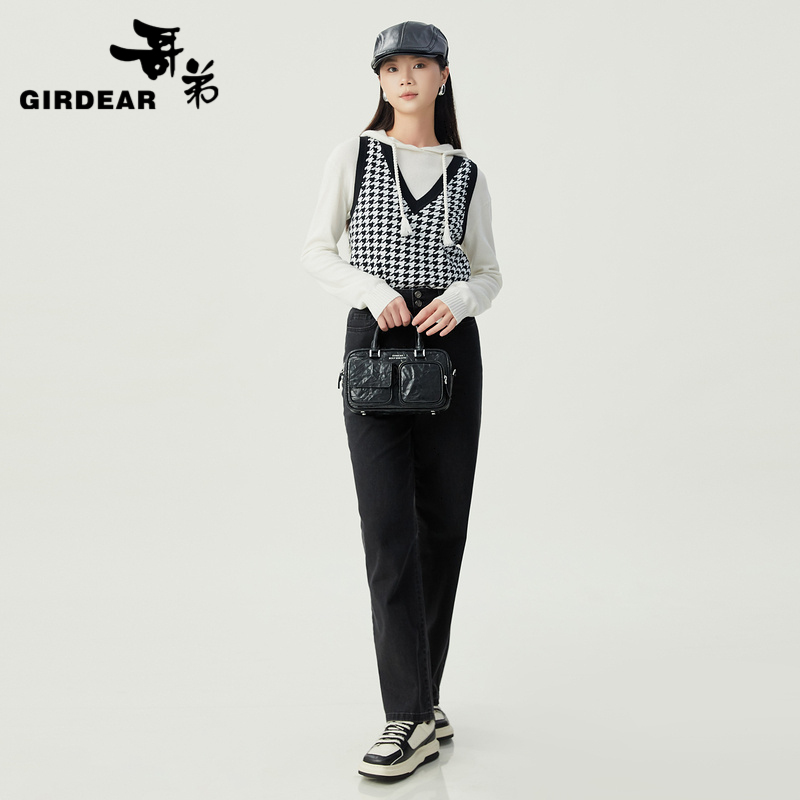 哥弟 V领提花千鸟格针织造型马甲1399644