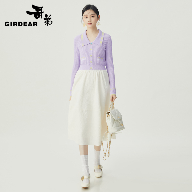 哥弟 甜美减龄大翻领竖坑条针织开衫1499228