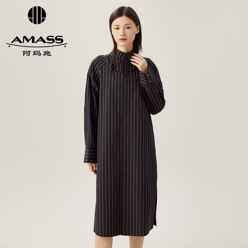 AMASS阿玛施小立领棉质条纹宽松中长款连衣裙衬衫裙5500455