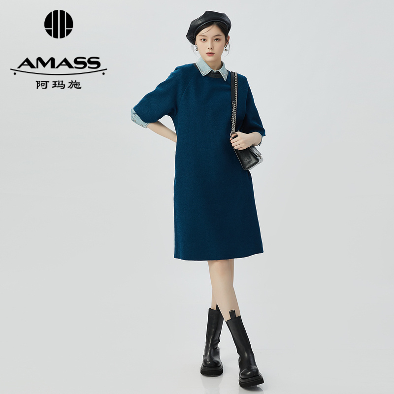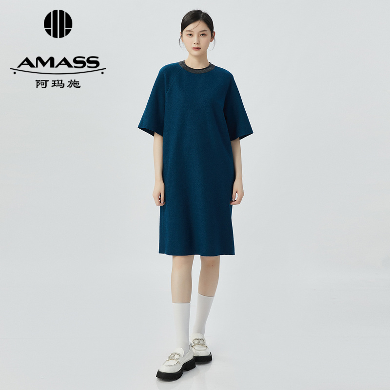 阿玛施AMASS2023新款绵羊毛质感圆领短袖纯色连衣中裙女5500520-2