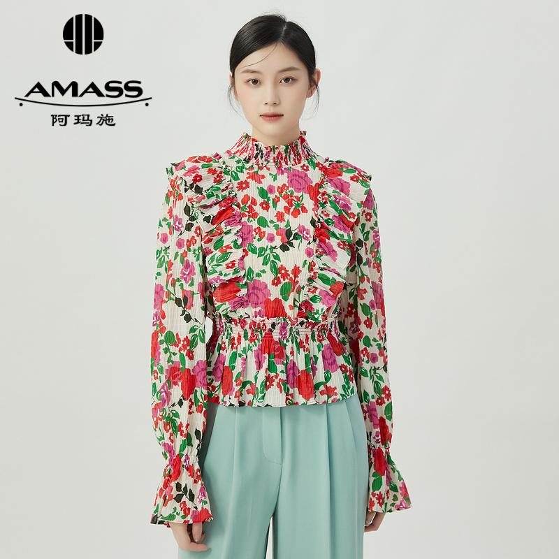 阿玛施AMASS 浪漫复古仪式感立领荷叶边花色衬衫5300885