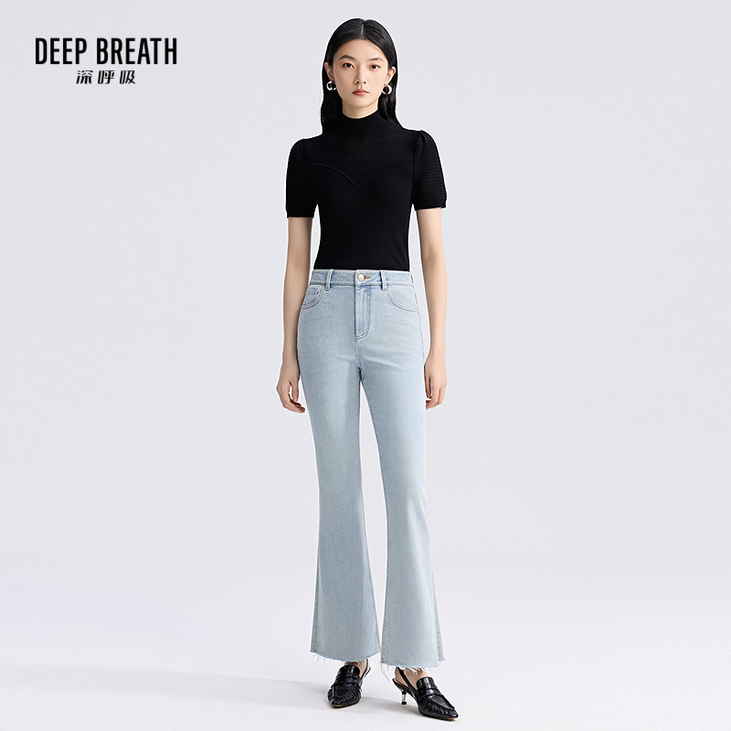 DEEP BREATH深呼吸女装 浅色高腰微喇裤毛须边弹力牛仔裤长裤A100446