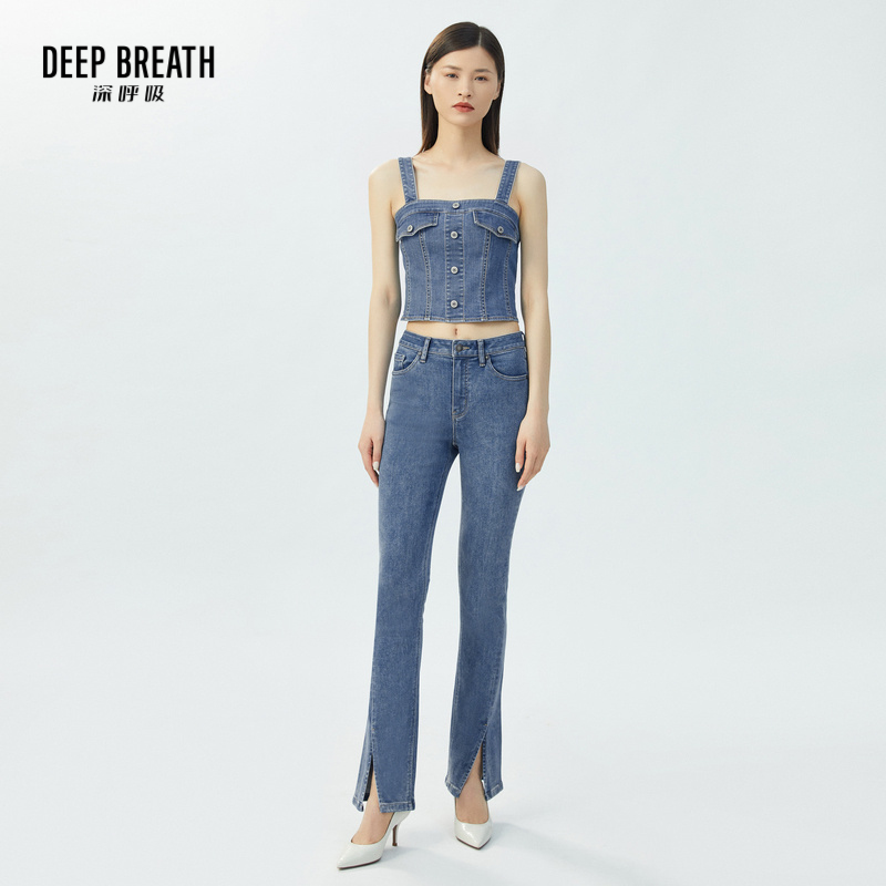 DEEP BREATH深呼吸女装 复古高腰前开叉微喇裤长裤牛仔裤A100127